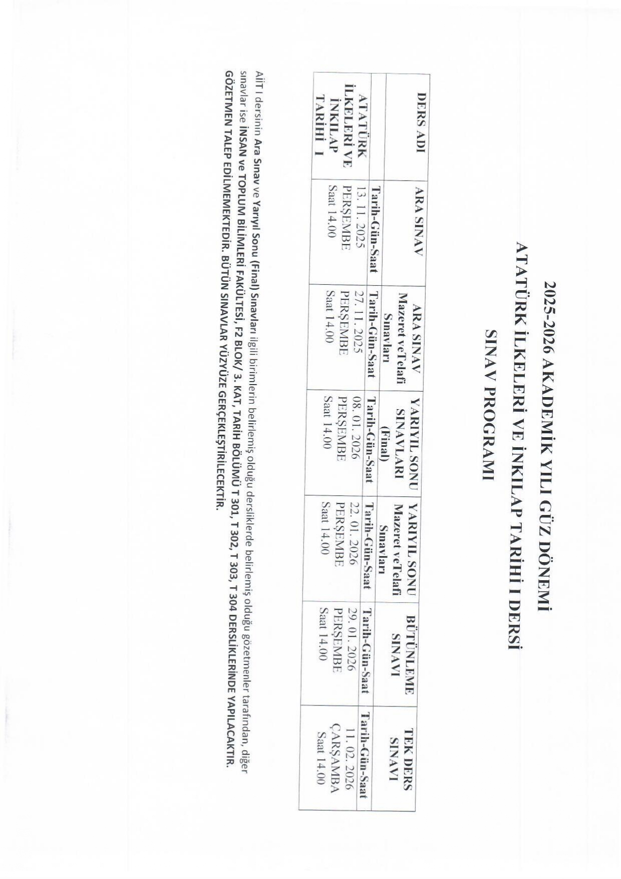 2026-2026 Akademik Yılı Güz Yarıyılı Atatürk İlkeleri ve İnkılap Tarihi I Dersi Sınav Programı